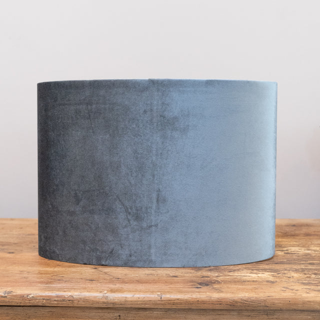 This shade is an unusual oval shape, meaning it can take up less space by sitting closer to the wall. Whilst still being magnificent in a grey velour with bronze lining inside the drum, please see images for fitting, by light and living.