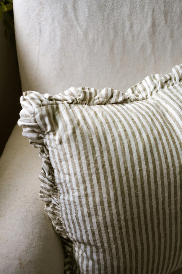The Provence Ticking Stripe Washed Linen Cushion Olive 40cm