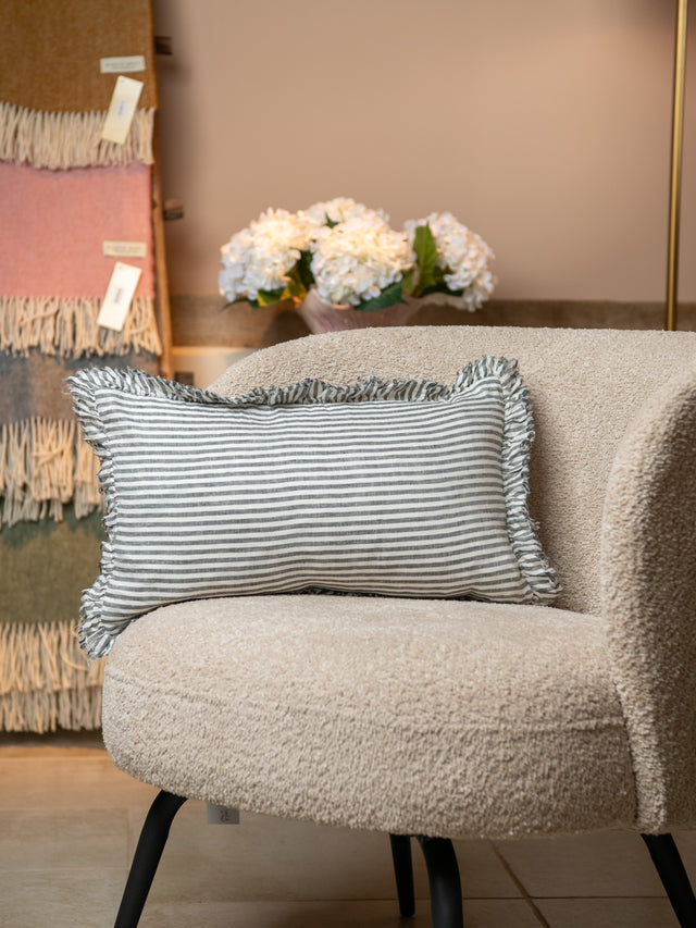 Measuring 50 x 30 cm, the washed linen charcoal stripe cushion is made from high-quality washed 100% linen, featuring a ruffled edge for a sleek and sophisticated look. Comes with a non live plucked feather inner. This stylish grey stripe tone is stylish and calm, blends beautifully with solid tones and just about any interior decor style.
